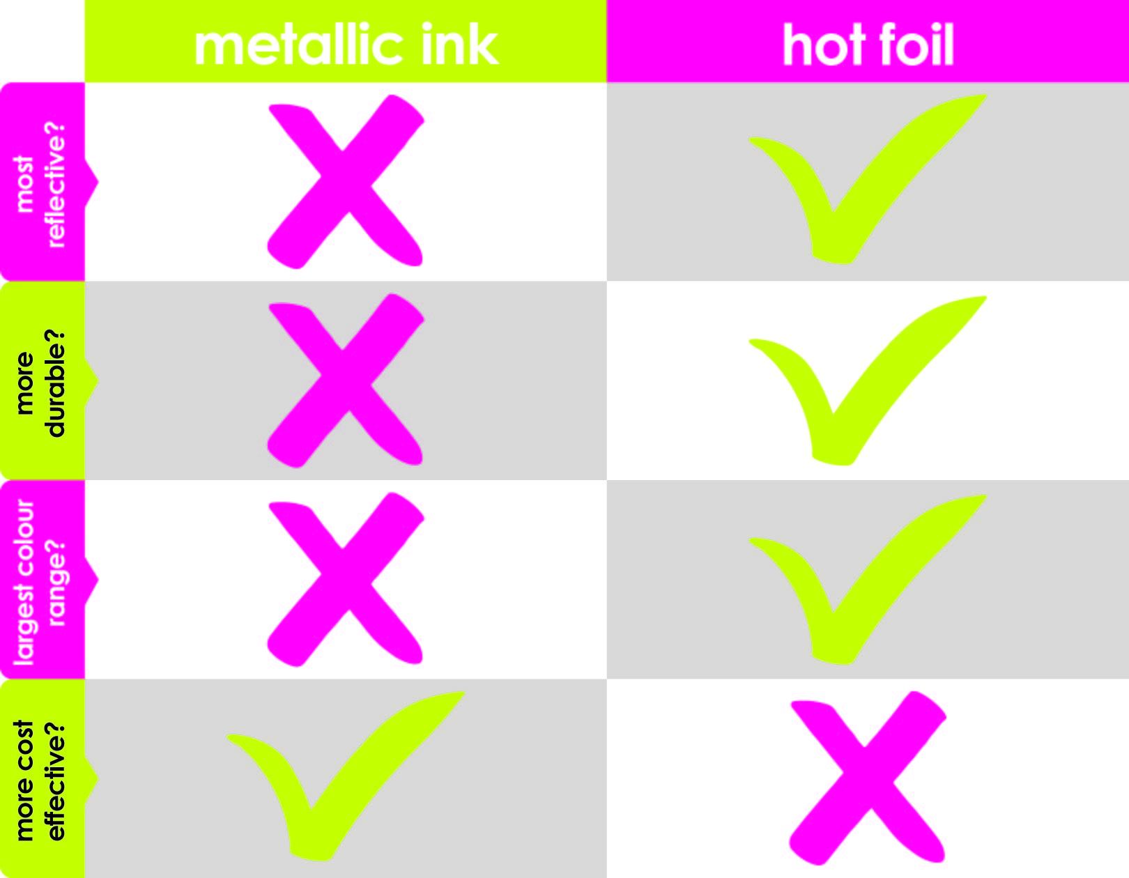 Winner: Metallic ink for variety; hot foil for consistency and vibrancy.